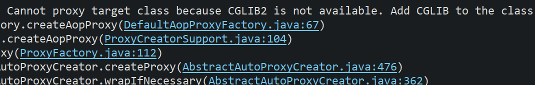 aspectjweaver 라이브러리를 의존 설정 한 뒤 실행해보겠습니다. 이번엔 아래와 같은 예외가 발생하며 메세지가 나옵니다. 현재 실행시킨 메소드의 클래스는 인터페이스를 구현하지 않은 객체이기 때문에 프록시 타겟이 될 수 없다는 의미입니다. 친절하게 Cglib 라이브러리를 추가하라는 메세지가 나옵니다.