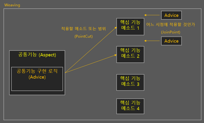 - Weaving : 공통 기능을 적용 하는 '행위'를 의미